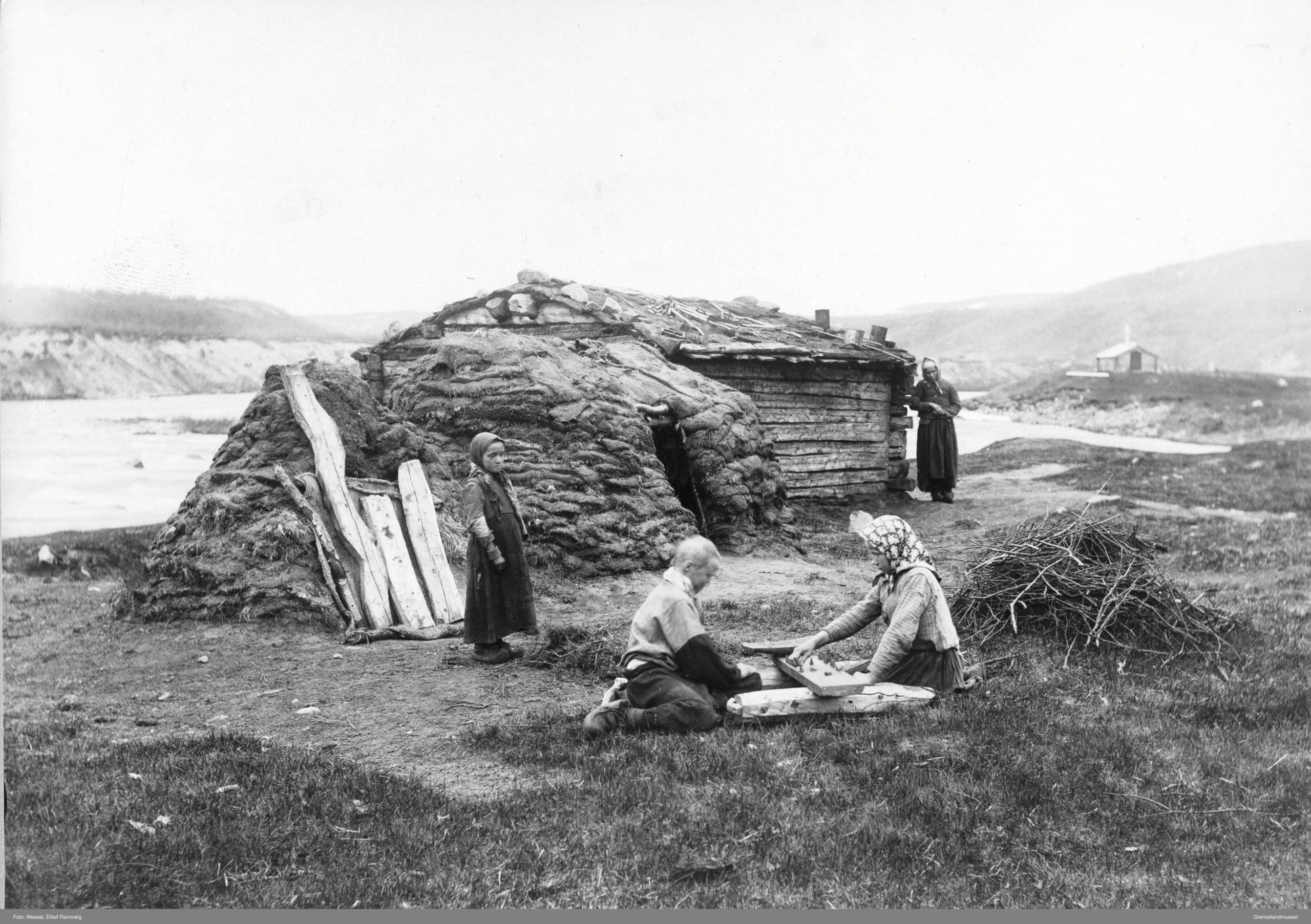 Foto: Skoltesamiske barn spiller det samiske brettspillet sáhkku, 1905. St. Georgs kapell i bakgrunnen. Ellisif Wessel/Grenselandmuseet